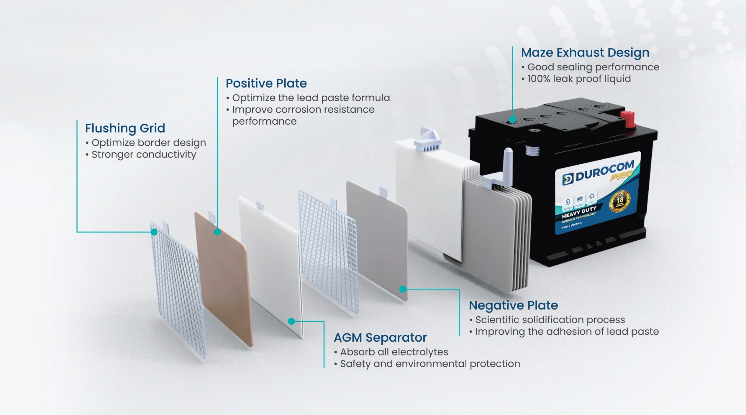 Every DUROCOM battery is the result of rigorous engineering and thoughtful design. From our flushing grid for stronger conductivity to the AGM separator that absorbs all electrolytes for environmental safety, we focus on every detail.